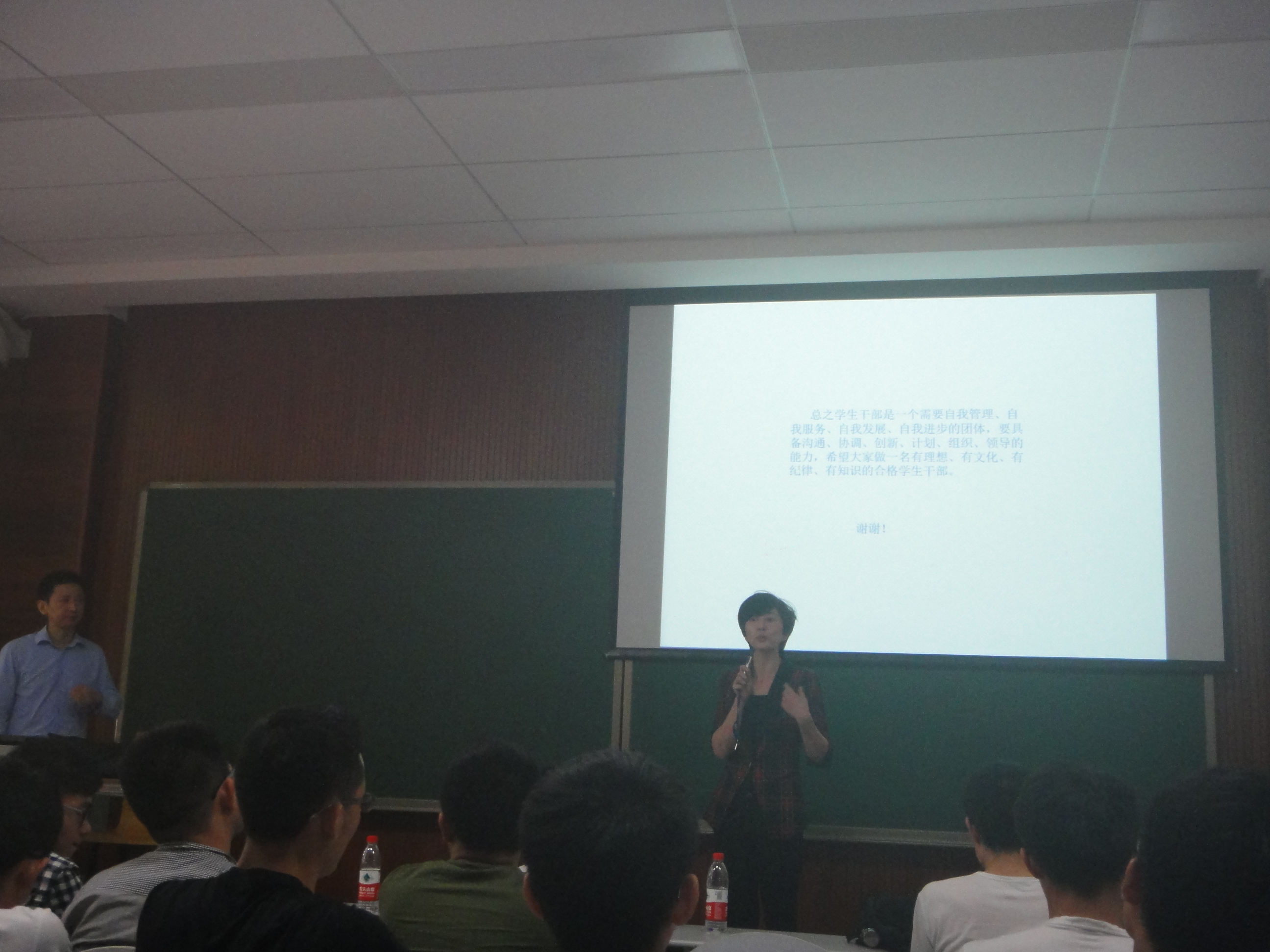 对于学生干部来说,意识很关键,能力也很重要。陈部长讲到,身在学生干部的岗位上,要时时刻刻锻炼提高自身各方面的能力。要学会沟通,要学会换位思考,事事替他人着想,给予他人尊重。其次,要有自我管理的能力,在学生工作中实现自我提升。要有创新、协调、计划、组织能力,在学生工作中要多调查研究总结,在策划活动时要有清晰的目标,创意的点子,严格的执行力和协调组织能力。最后,学生干部不可缺领导能力,作为团队的领头羊,作为团队的精气神,要有把问题转化为机遇的能力,遇到难题不折不挠。