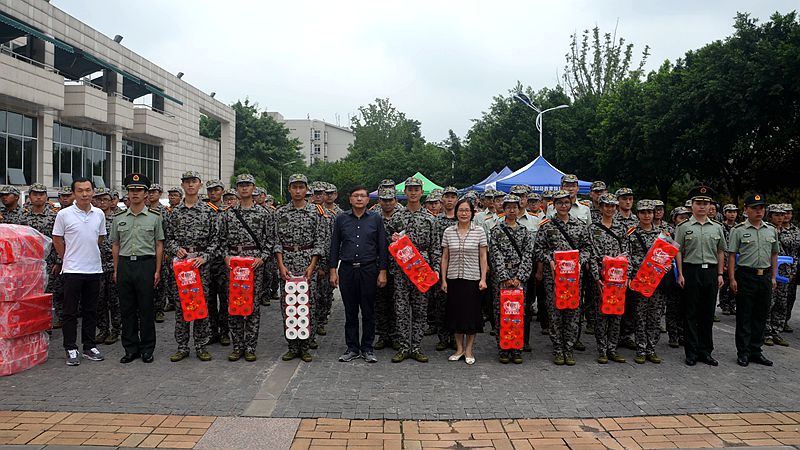 致辞完毕,万玲书记、严波副院长为同学们依次发放了慰问品。随后,学院领导同军训带队教官进行了亲切交谈,并对带队教官的辛苦付出表示感谢。