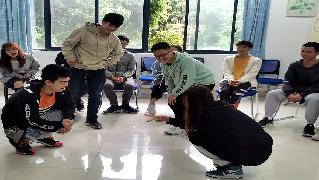 第一个游戏是“小鸡变凤凰”,同学之间通过猜拳的方式从“鸡蛋”不断晋升至“凤凰”,期间同学需要以相似的体态表示所处的阶段。游戏过程中,同学们边表演动物边猜拳,乐在其中。游戏结束后,孟雁鹏老师邀请同学们发表内心的感受,最终仍是“鸡蛋”的高拯同学表示,他反复从“大鸡”跌落到“鸡蛋”虽然没有成为“凤凰”,但也感到很刺激、很畅快。孟老师对此称赞并提到,我们可能都觉得“鸡蛋”并不幸运、境遇不好,但是“鸡蛋”本人却对此感到乐观和满足,所以我们不必过于操心他人,而要更多地关注自己的感受。