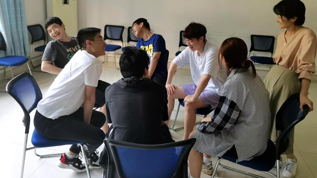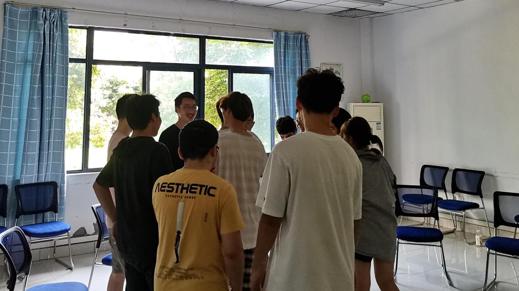 孟雁鹏老师组织同学们开始破冰活动,同学们围成一圈,通过肢体接触的方式向其他同学问好。这个小游戏拉近了同学们的距离,同学们在欢声笑语中放下戒备与腼腆,绽放笑容,气氛逐渐活跃起来。