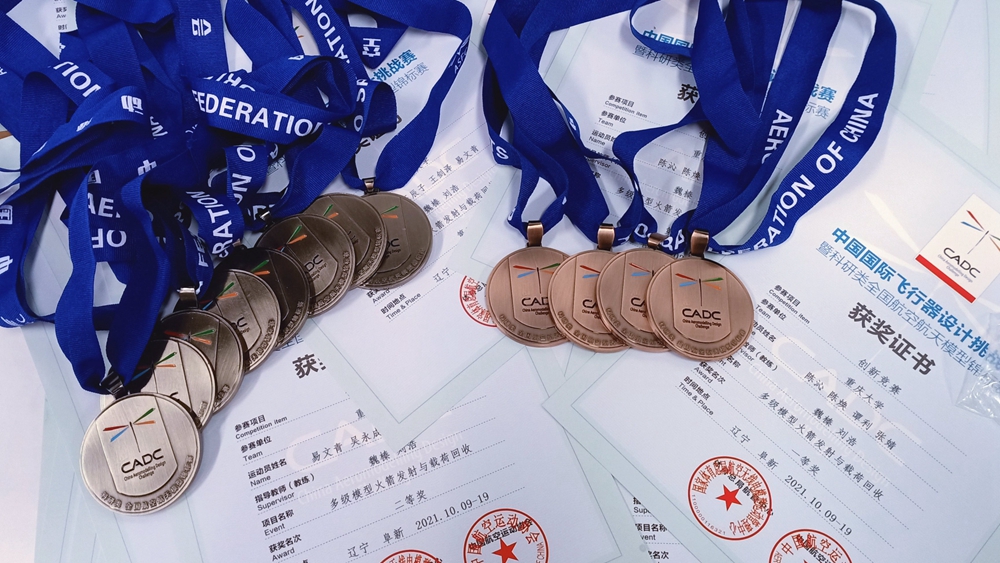 2021年中国国际飞行器设计挑战赛(简称:CADC)总决赛于10月9日至19日在辽宁省阜新市举行,本次比赛共吸引了来自全国80余所高校的1700余名学生参加。重庆大学组织航模队参加了此次比赛并取得了历史最好成绩,荣获国家级一等奖1项,国家级二等奖1项,国家级三等奖1项,多级模型火箭发射与载荷回收单项季军、团体亚军。