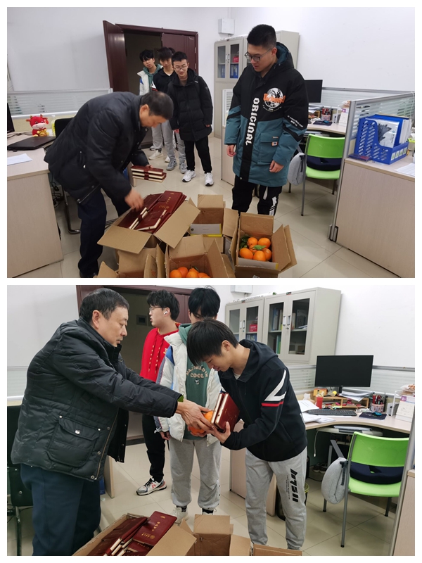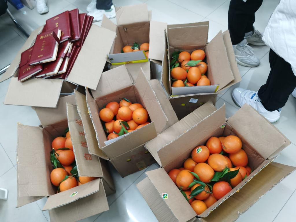 慰问品是每位同学一本特制的笔记本和两个香气四溢的脐橙。摆的满满当当的箱子里装的不止是简单的物品,而是学院对同学们的关心和喜爱。