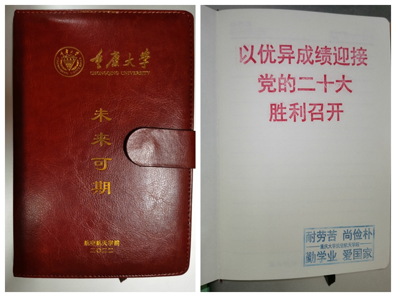 漂亮的笔记本内寄托了学院对同学们在新一年内不断向上,顽强拼搏的鼓励和祝愿,扉页上的“以优异成绩迎接党的二十大胜利召开”的前进宣言和“耐劳苦,尚俭朴,勤学业,爱国家”的校训更是使同学们在翻开这个笔记本时就体会到了学院的良苦用心,相信在未来日子里同学们使用它的时候也会有受到鼓励的感觉吧。
