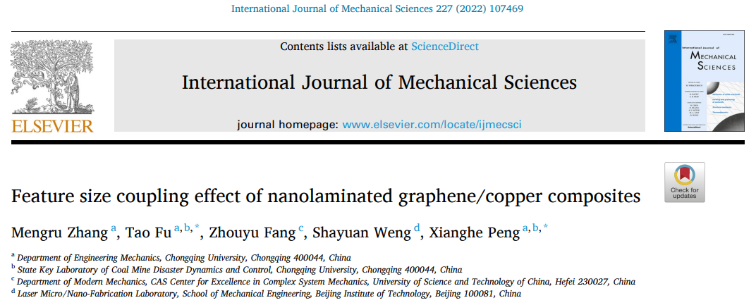 工程力学专业本科生张梦茹在国际学术期刊International Journal of Mechanical Sciences [中科院1区(升级版),IF:6.772]上发表了题为“Feature size coupling effect of nanolaminated graphene/copper composites”的研究论文,链接://www.sciencedirect.com/science/article/pii/S002074032200371X#!。